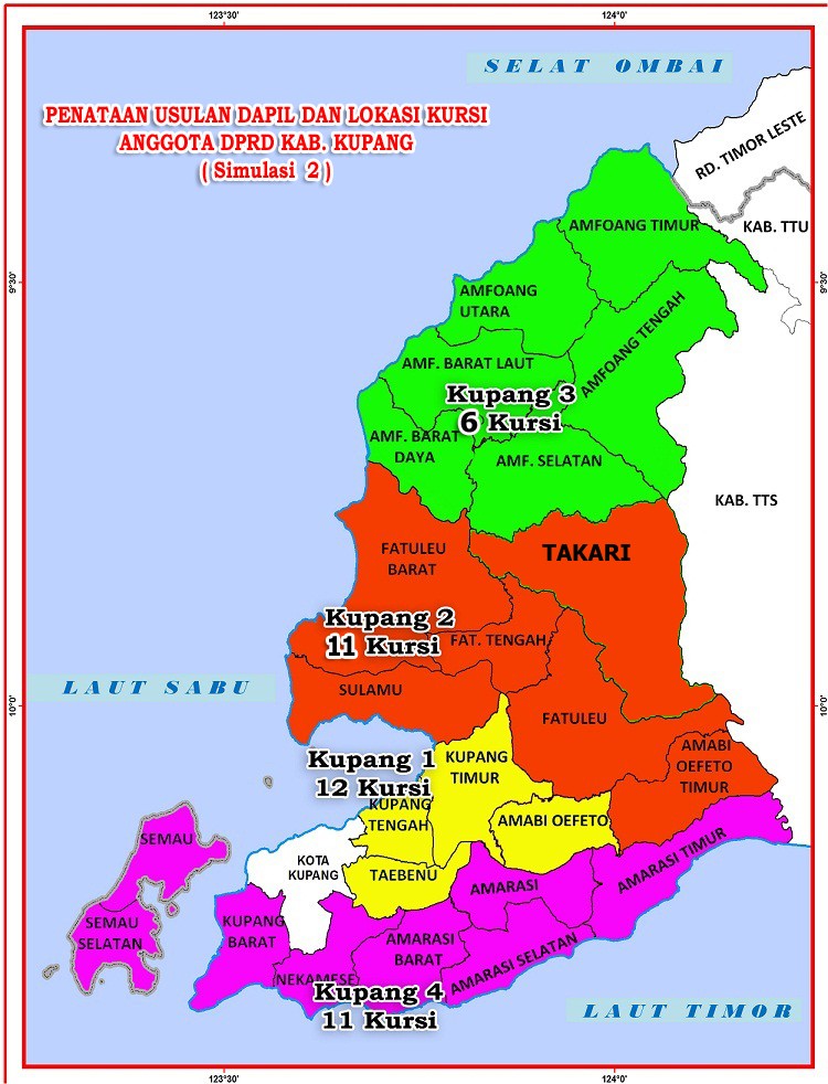 - Sejumlah partai masing-masing Pimpinan Partai PKPI, Perindo, PBB, PAN, Gerindra, PKS, Hanura, PKB dalam Berita Acara Rapat pada tanggal 12 Januari 2018 menyatakan menyetujui enam kecamatan Amfoang menjadi DAPIL Tersendiri dan Kecamatan Takari digabungkan ke Kecamatan Fatuleu, Fatuleu Barat, Fatuleu Tengah, Sulamu dan Amabi Oefeto Timur dalam satu DAPIL sebagaimana peta DAPIL terlampir. (Simulasi 2)