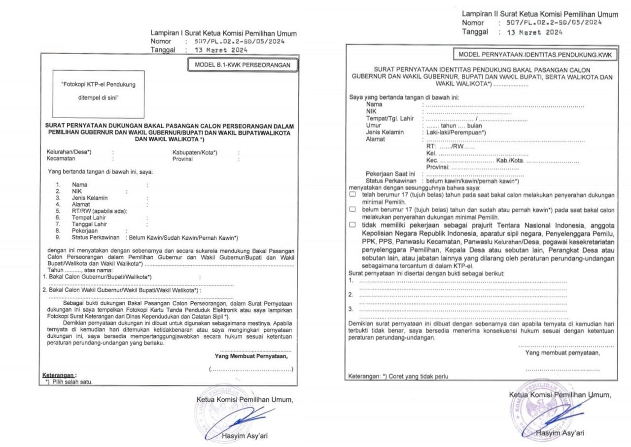 Demikian Pengumuman ini dibuat, atas perhatiannya disampaikan terima kasih. KPU juga melampirkan MODEL B-1 KWK PERSEORANGAN dan MODEL PERNYATAAN IDENTITAS PENDUKUNG KWK.***