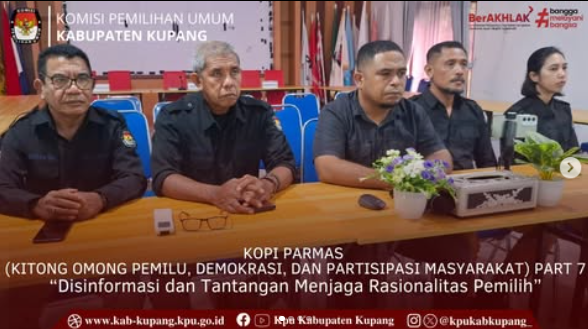 Oelamasi,- Komisi Pemilihan Umum (KPU) Kabupaten Kupang mengikuti kegiatan KoPi Parmas (Kitong Omong Pemilu, Demokrasi, dan Partisipasi Masyarakat) Part 7 yang diselenggarakan secara daring oleh KPU Provinsi NTT pada, Rabu (14/01/26). Dalam sambutan Plh. Ketua KPU NTT, Petrus Kanisius Nahak didampingi Ketua Divisi Sosdiklih Parmas SDM, Baharudin Hamzah, Ketua Divisi Perencanaan Data dan Informasi, Lodowyk Frederik, Elyaser Lomi dan Plt. Sekretaris KPU NTT, Melan Hege menekankan, disinformasi pemilu merupakan salah satu tantangan serius dalam penyelenggaraan demokrasi, baik pada masa tahapan maupun non tahapan. KoPi Parmas Part 7 mengangkat tema “Disinformasi Pemilu dan Tantangan Menjaga Rasionalitas Pemilih” dengan moderator Kasubag Teknis Penyelenggaraan Pemilu, Partisipasi dan Hubungan Masyarakat KPU Kota Kupang, Abdurrahman. Adapun narasumber dalam kegiatan tersebut adalah Anggota KPU Kabupaten Flores Timur selaku Ketua Divisi Sosdiklih Parmas dan SDM Herman J. Latol serta Anggota KPU Kabupaten Manggarai Timur selaku Ketua Divisi Teknis Penyelenggaraan Konradus A. Sandur. Melalui diskusi ini, KPU Kabupaten Kupang berharap dapat mengimplementasikan berbagai pengetahuan yang diperoleh guna meningkatkan literasi politik masyarakat dan mendorong pemilih yang cerdas, kritis, serta rasional, demi terwujudnya Pemilu yang berintegritas dan demokratis.