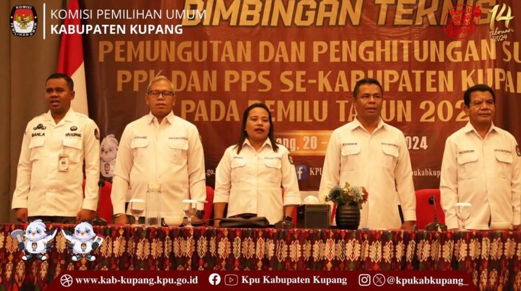 Jakarta,- Komisi Pemilihan Umum Republik Indonesia (KPU RI) melantik anggota KPU 29 kabupaten/kota pada 9 provinsi untuk periode 2024-2029. Pelantikan dipimpin langsung Ketua KPU RI, Hasyim Asy’ari, Sabtu (03/2/2024) di Kantor KPU RI, Jakarta. Pelantikan anggota KPU 29 kabupaten/kota pada 9 provinsi periode 2024-2029 itu, berdasarkan Surat Keputusan (SK) KPU RI Nomor 153-181 tahun 2024, tentang Pengangkatan Anggota KPU Kabupaten/Kota pada 29 Kabupaten/Kota di 9 Provinsi Periode 2024-2029. Sebelum pelantikan, pembacaan sumpah-janji oleh Ketua KPU RI Hasyim Asyari yang selanjutnya dilakukan pengambilan sumpah janji dan penandatanganan berita acara pelantikan. Dari pelaksanaan pelantikan tersebut, diantaranya yang dilantik adalah anggota KPU Kabupaten Kupang, Provinsi Nusa Tenggara Timur (NTT). Adapun yang dilantik adalah Nichson Manggoa sebagai Ketua KPU Kabupaten Kupang, Klemens Lega Laot sebagai Anggota Divisi Perecanaan, Data dan Informasi, Samsul Gole sebagai Anggota Divisi Teknis Penyelenggaraan, Inestha Chrisane Arianti Louk sebagai Anggota Divisi Parmas dan SDM, Polce Roby Toby Dethan sebagai Anggota Divisi Hukum dan Pengawasan. Segenap Keluarga Besar Komisi Pemilihan Umum Kabupaten Kupang melalui akun resmi media sosial KPU Kabupaten Kupang mengucapkan terima kasih atas pengabdian dan dedikasinya kepada Ketua dan Anggota KPU Kabupaten Kupang periode 2019-2024.***