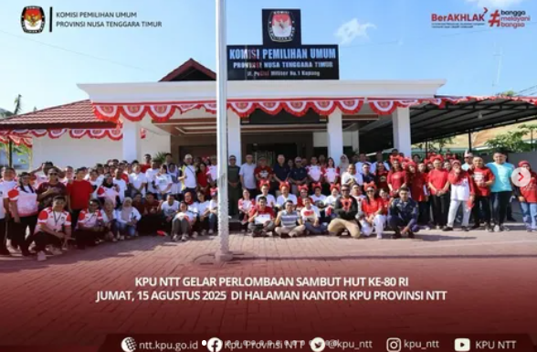 Kupang,- KPU Provinsi NTT menggelar apel dalam rangka memperingati Hari Ulang Tahun ke-80 Republik Indonesia pada Jumat (15/8) di halaman kantor KPU Provinsi NTT. Apel dipimpin oleh Ketua KPU NTT, Jemris Fointuna, dan dihadiri oleh Anggota KPU NTT Baharudin Hamzah, Lodowyk Fredrik, Elyaser Lomi Rihi, serta Sekretaris KPU NTT Adiwijaya Bakti. Hadir Ketua dan Anggota KPU Kota Kupang serta KPU Kabupaten Kupang, bersama para sekretaris dan jajaran sekretariat.
