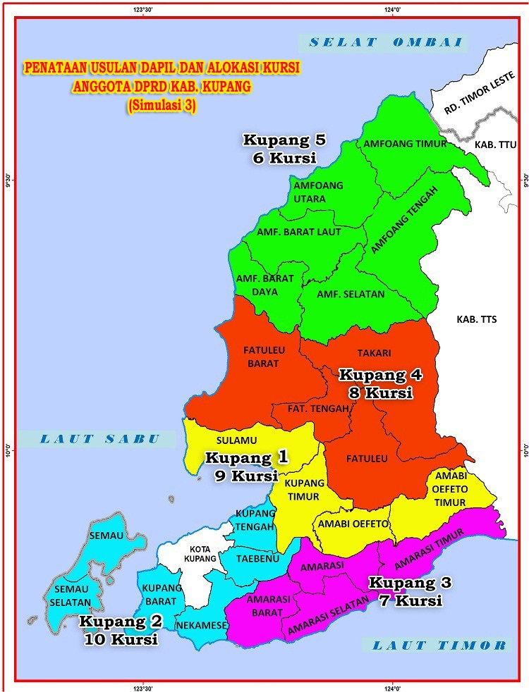 Partai Demokrat menyetujui enam kecamatan Amfoang menjadi Dapil tersendiri atau Dapil 2014 ditata ulang menjadi 5 (lima) dapil. (Simulasi 3)