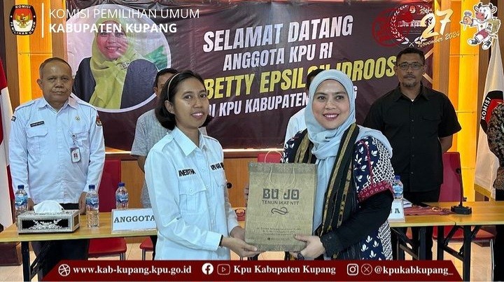 Kupang,-Anggota KPU RI Betty Epsilon Idroos melakukan kunjungan kerja ke KPU Kabupaten Kupang, pada Kamis 21 November 2024. Pada kunjungan ini Betty Epsilon Idroos didampingi Anggota KPU Provinsi NTT Baharudin Hamzah, Sekretaris KPU Provinsi NTT Adiwijaya Bakti dan jajaran sekretariat KPU Provinsi NTT. Diterima oleh Ketua, Anggota dan jajaran Sekretariat KPU Kabupaten Kupang, dalam kunjungannya Betty memberikan penguatan dan arahan dalam kesiapan melaksanakan puncak tahapan pemilihan 2024 pada 27 November 2024 mendatang. Dalam arahannya Betty juga menyampaikan bahwa Pilkada adalah tempat bertemunya seluruh pekerjaan yang dikerjakan oleh semua subbagian dan semua Divisi. "Dalam bekerja Kuncinya itu adalah komunikasi, tidak ada masalah yang tidak bisa diselesaikan, jadi berkomunikasilah dengan baik," pesannya. Dalam kesempatan ini Betty juga menyampaikan pentingnya agar KPU Kabupaten Kupang membentuk tim helpdesk untuk seluruh persoalan logistik, tungsura termasuk di dalamnya juga SiRekap. Dalam kunjungan ini Betty melakukan peninjauan ke gudang logistik KPU Kabupaten Kupang untuk memastikan kesiapan distribusi logistik yang akan dilaksanakan oleh KPU kabupaten Kupang. Dalam akhir kunjungannya di KPU Kabupaten kupang, Angota KPU RI Betty Epsilon Idroos melakukan monitoring pelaksanaan simulasi nasional serentak uji coba sirekap di Kelurahan Babau, Kecamatan Kupang Timur, Kabupaten Kupang, NTT.***